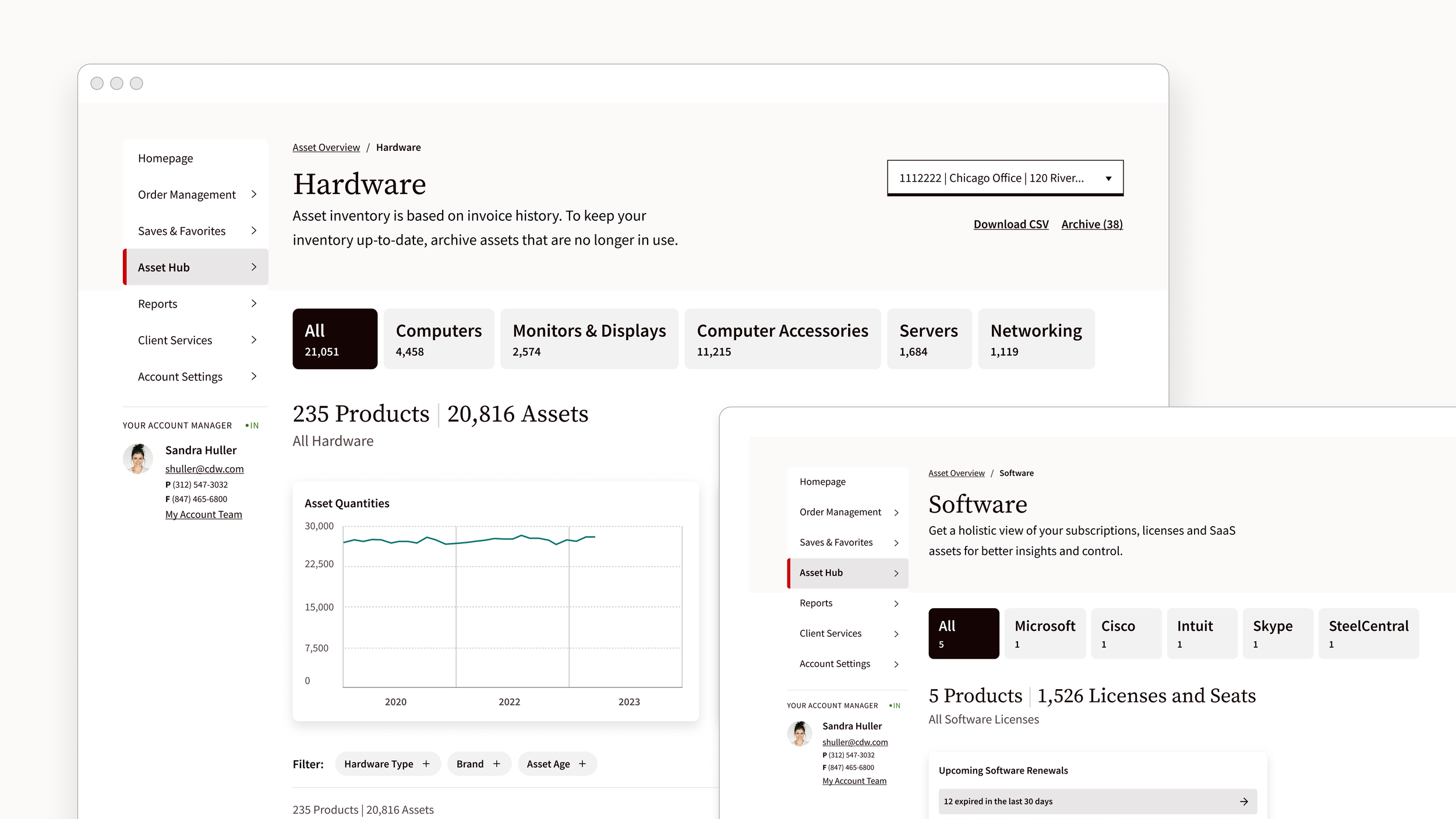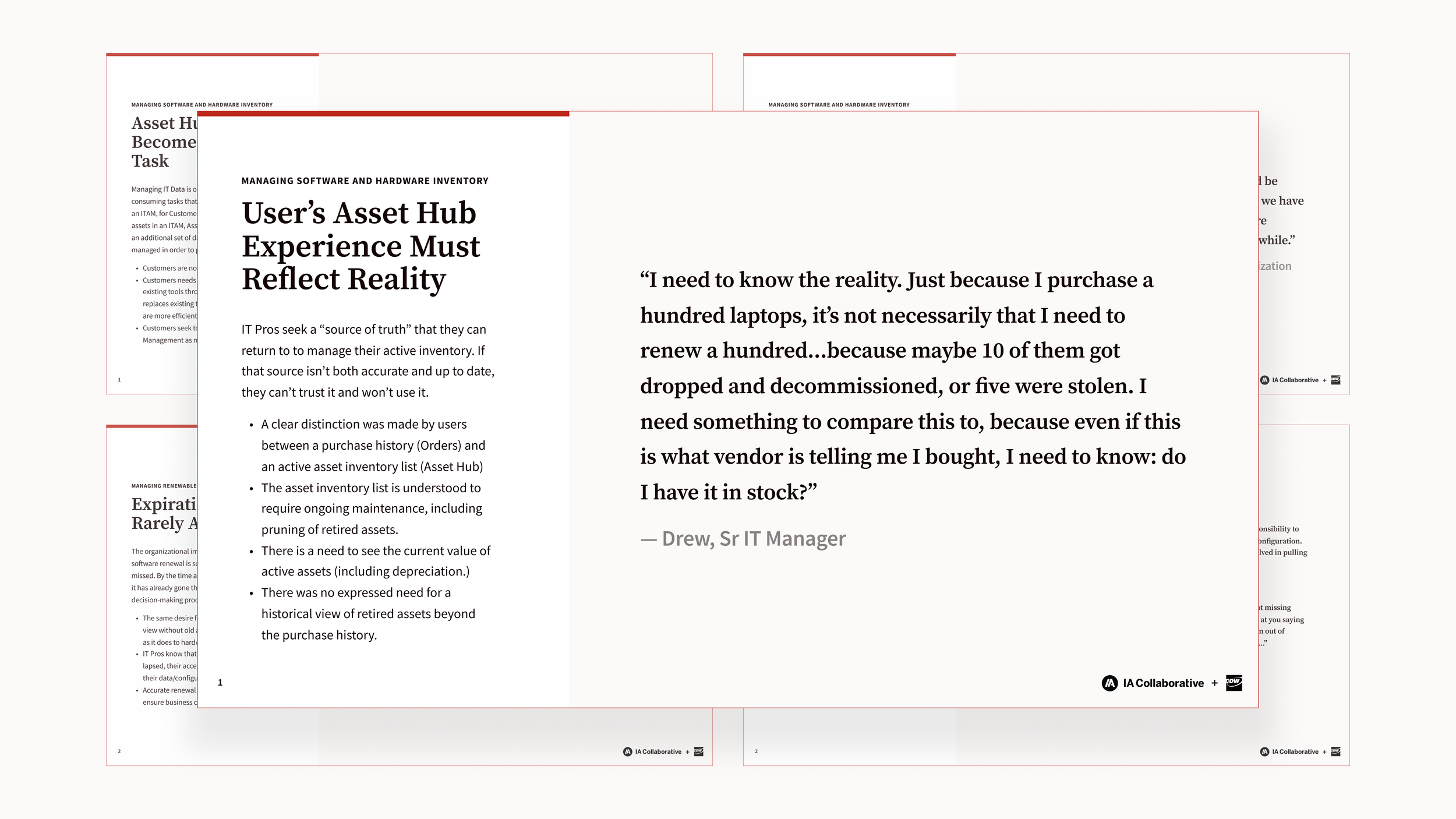 CDW has been the primary retailer serving IT professionals for decades. At IA Collaborative, I was on an embedded team supporting the Asset Hub, a new platform helping IT professionals track IT investments, view historical spending, and renew software subscriptions.