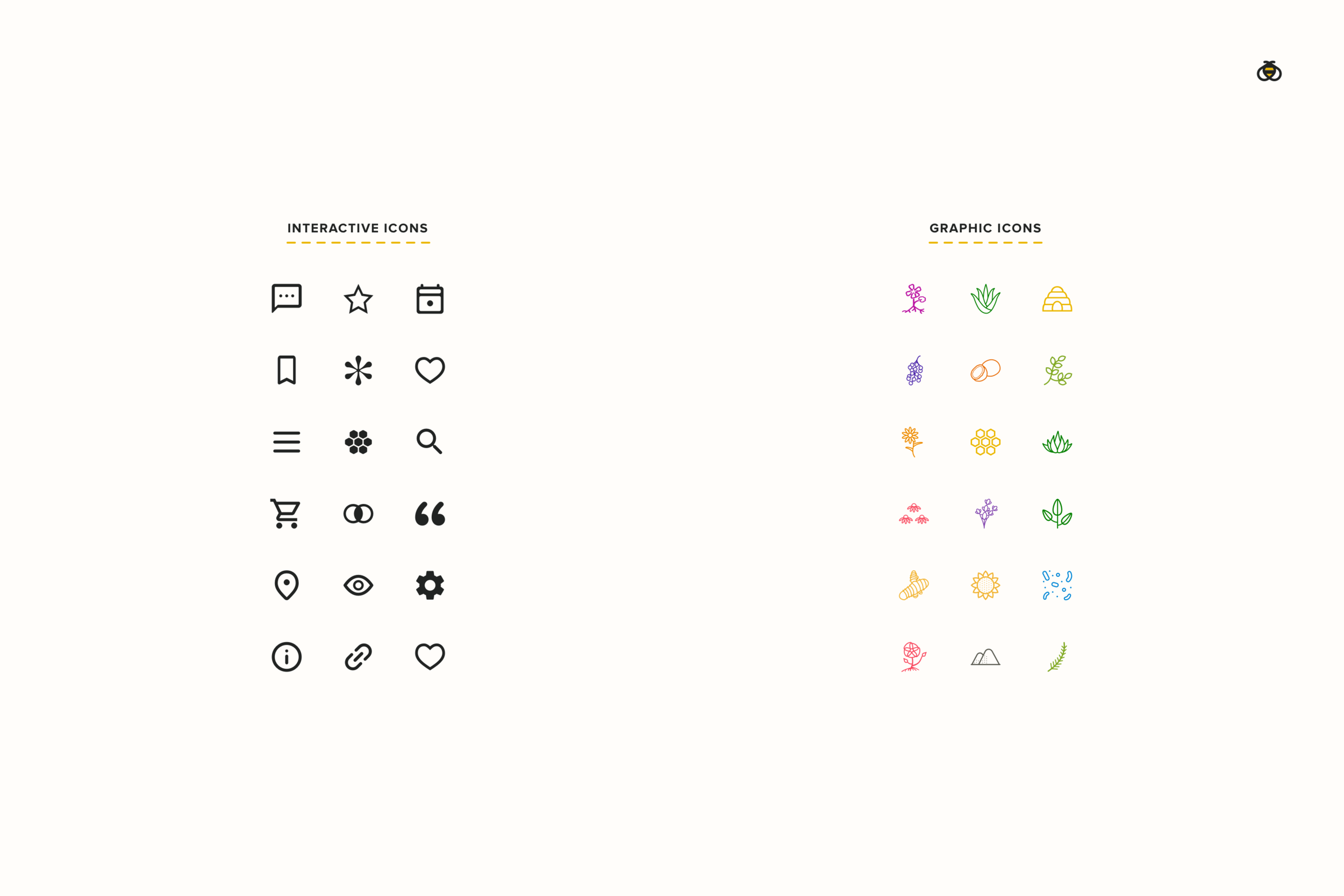Interactive icons adhere to color accessibility standards and are more geometric and consistent in their appearance. Graphic icons are used for decoration and contain a much more free-spirited approach to color, shape, and detail.